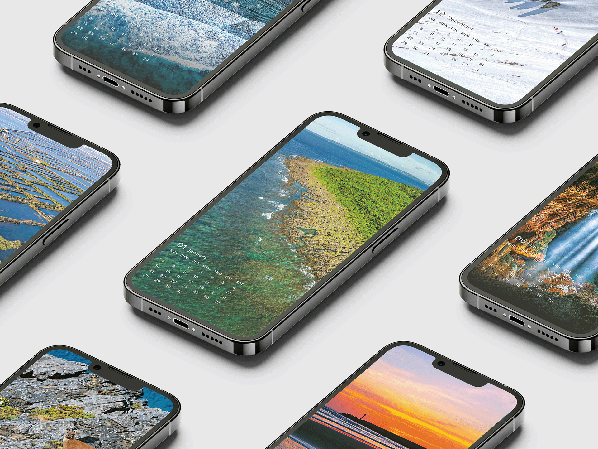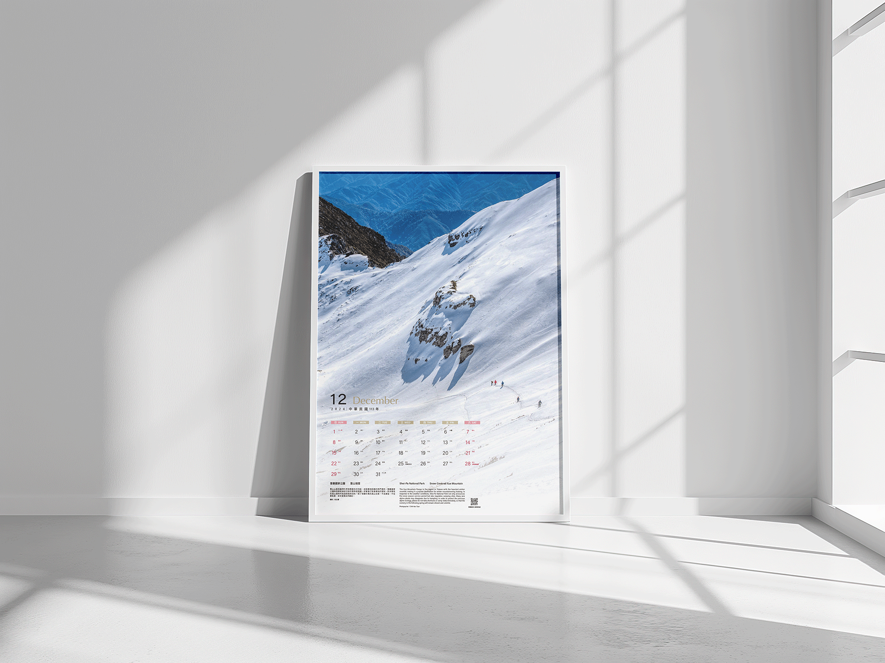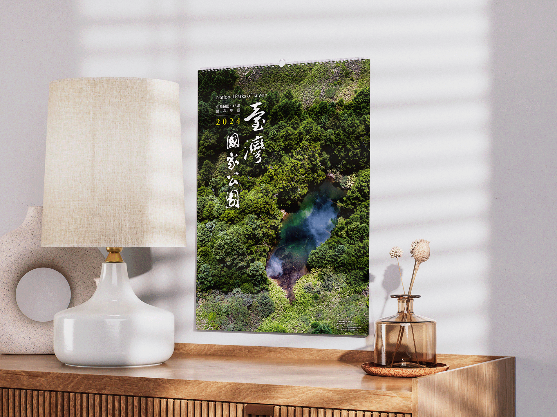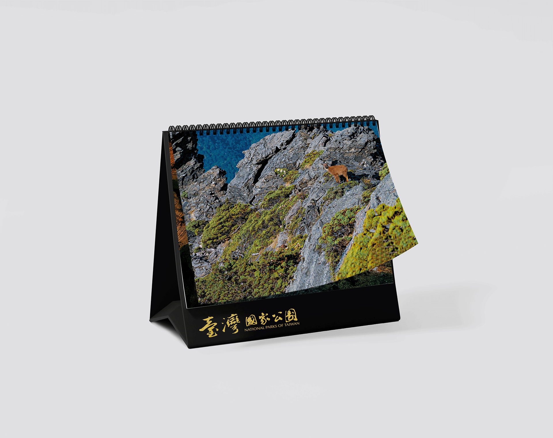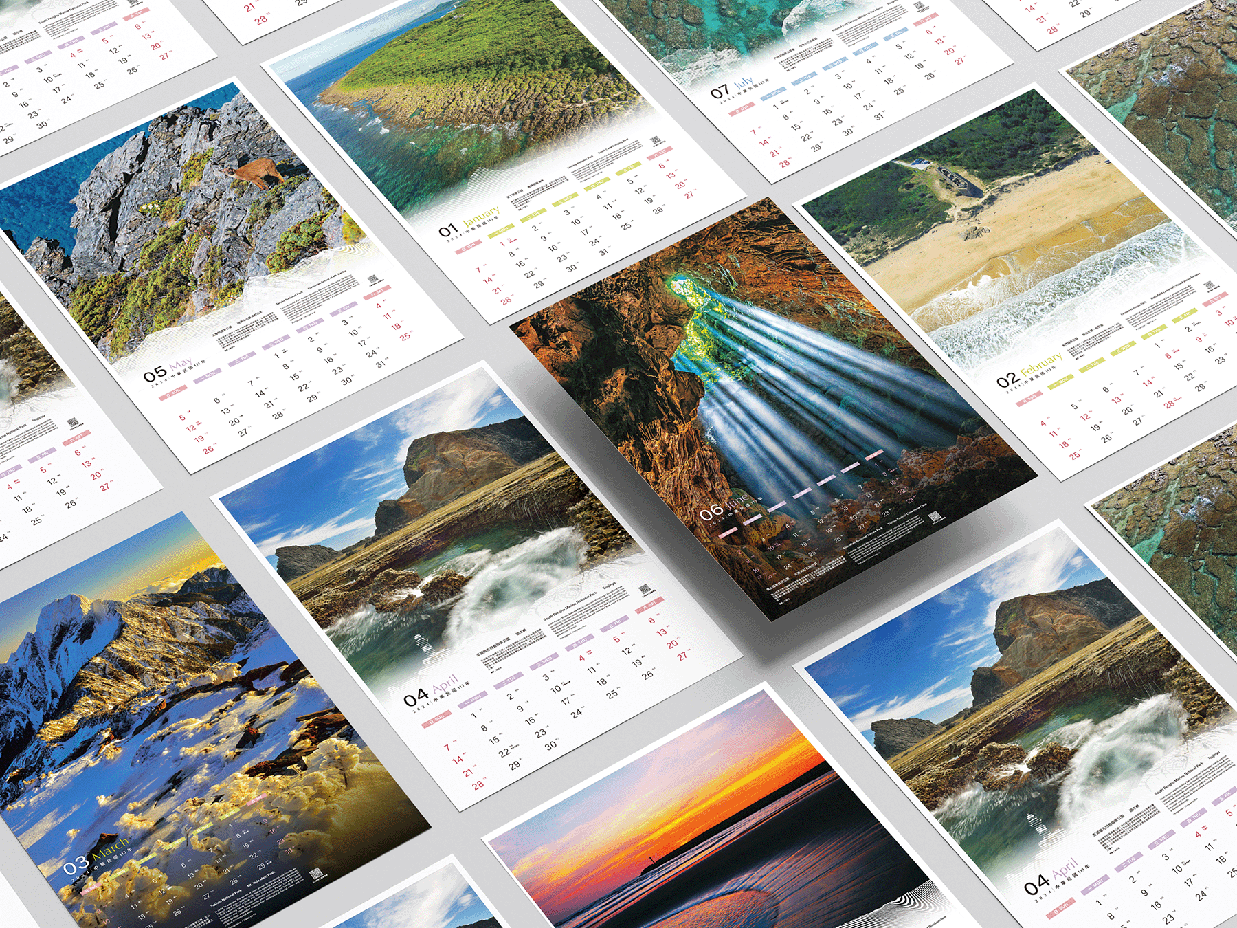 突破以往國家公園月曆內頁皆為上圖下字的版型,此次以對開滿版展現國家公園景致的氣度,每季一次滿版版型設計,行成固定韻律邏輯,而滿版照片選擇,以海、陸比例1:1 為原則。滿版概念以海報式的意象設計,選用壯麗經典的照片並採用不留白框的模式,以展現攝影作品的氣勢,並且兼顧四季不同氛圍,讓人一眼驚艷。而日期及文字區塊位置隨照片內容配置於最合適的位置,以維持畫面的連續性,另外顏色則是因照片而異,以可視性、美感為原則。